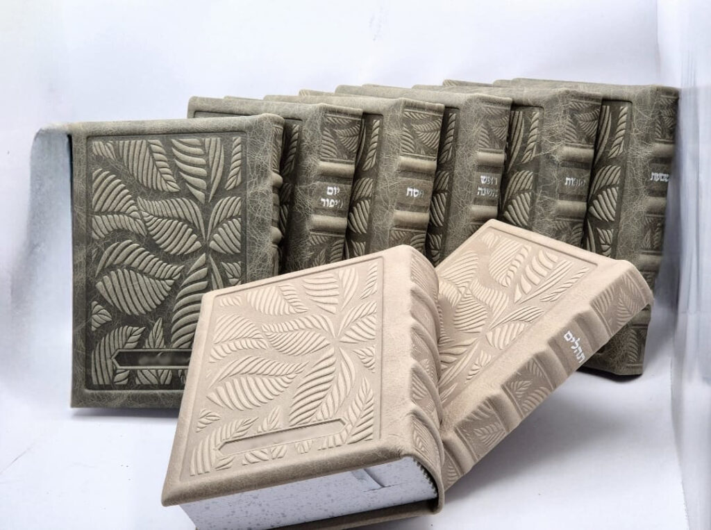 A special set of Machzorim crafted with high-quality leather and a unique design of your choice, featuring embossed personalization of the name on the cover